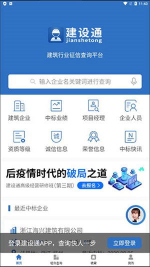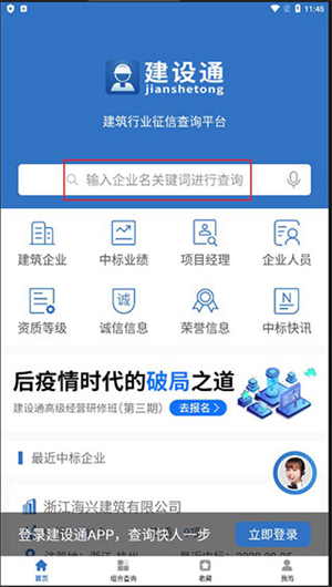 想要查询建筑企业的相关信息,就用建设通。作为建筑业的大数据服务平台,建设通能够提供全国范围内建筑企业的中标记录、诚信状况、建造师的在建项目、企业获得的荣誉、资质等级、工商注册信息以及法律诉讼情况等多方面的查询服务。