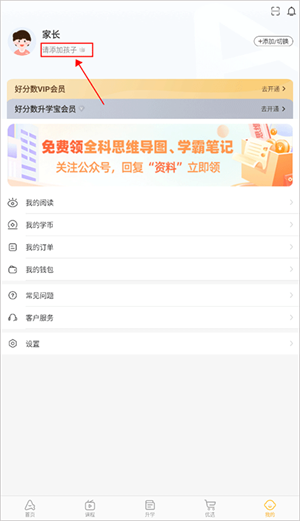 1、在好分数家长版“我的”界面→添加/切换→右上角“添加孩子”→去绑定,绑定学生即可;