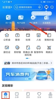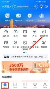 1、打开郑好办app,在【首页】界面,选择右上方【契税补贴】选项,