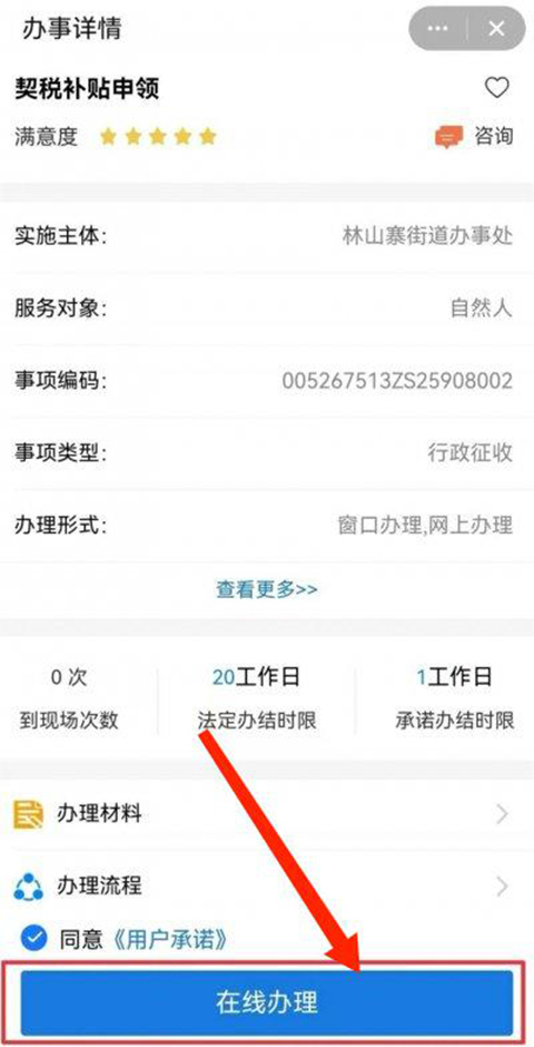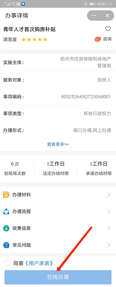 3、进入【办事详情】界面,了解完青年人才首次购房补贴相关信息后选择下方【在线办理】即可申请购房补贴了。