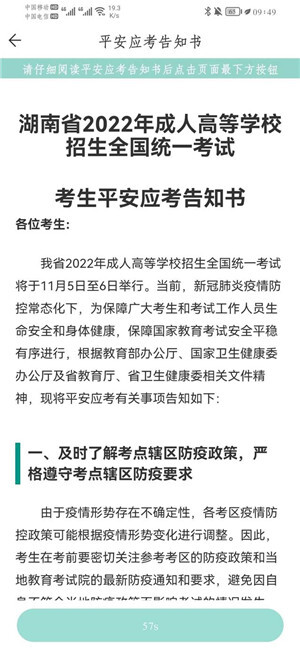 3、阅读“湖南省2022年成人高等学校招生全国统一考试平安应考告知书”60s