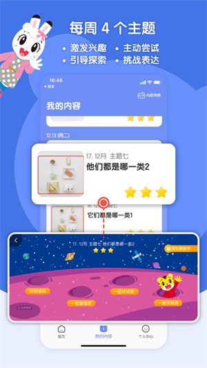 2.教育学习:应用程序中有很多的科学、动物、语文、数学、英语、音乐等教育类的互动课程,通过有趣的游戏和互动体验,来激发孩子们的学习兴趣。