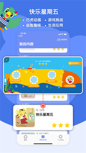 1.游戏玩乐:巧虎的游戏世界,包括休闲游戏、益智游戏、童话故事等,有趣好玩,能够开发孩子的智力和想象力。