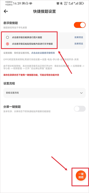 5、开启之后,屏幕右下角便会出现一键搜题的悬浮图标。随后返回快捷搜题设置界面,在悬浮窗搜题界面下方,选择是通过截屏进行图片搜题,还是粘贴内容进行文字搜题。