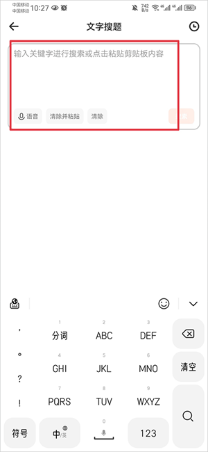 在首页选择“文字搜索”后,输入栏左下方会弹出语音输入按钮,点击该按钮即可进入语音输入状态,此时你所说的内容将以文字形式同步输入到搜索框,最后点击搜索就行。