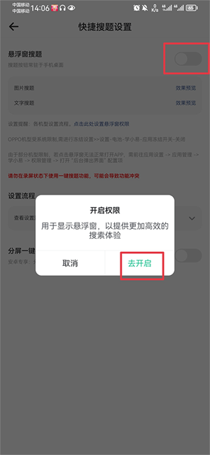 2、然后在快捷搜题设置中点击悬浮窗搜题按钮,并点击去开启