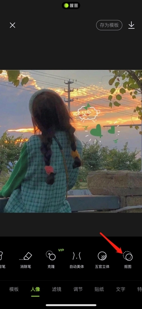 2、导入以后,点击人像,然后上方功能栏往左边滑动,点击【抠图】;
