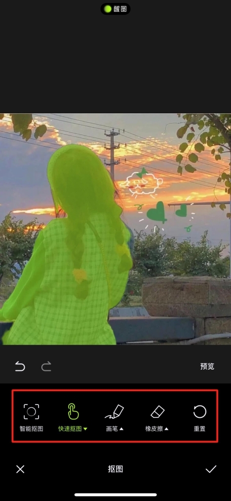 3、在这里可以选择智能抠图,如果有没有选择到地方可以利用画笔或者橡皮擦进行微调;感觉差不多了以后点击右下方的“√”;
