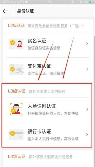 接下来,在“L3级认证”服务栏中,依据个人需求挑选认证方式,此处以“人脸识别认证”为例。