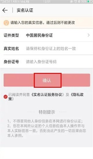 根据提示,完善证件、姓名、身份证号等相关信息后,点击“确认”;随后依据提示完成人脸识别操作就行。