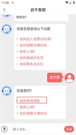 2、进入在线客服页面,发送退学费,选中如何申请退款