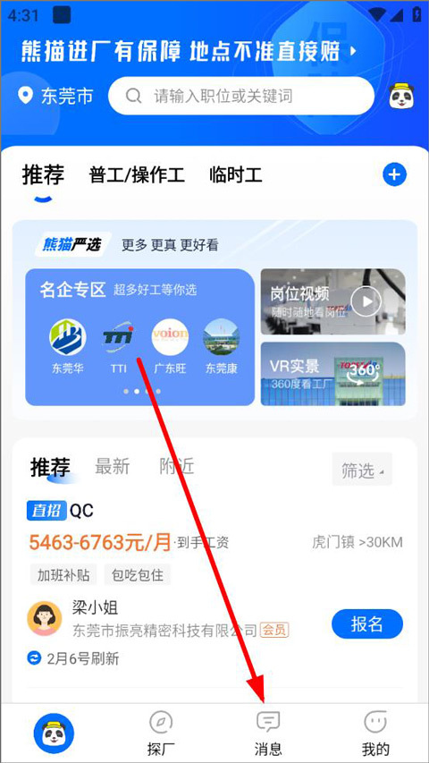 1. 开启熊猫进厂app,登录后进入首页。在首页,用户能够看到推荐职位、普工/操作工、临时工等信息,接着点击消息。