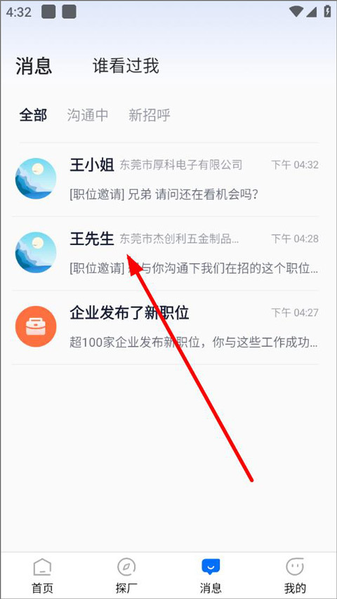 2、打开消息页面,用户可查看正在沟通中的职位,点击进入聊天页面;