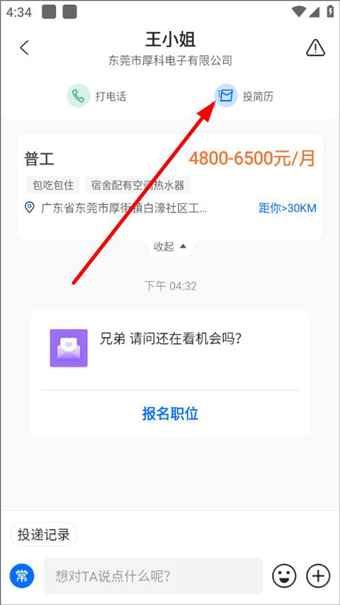 3、当进入聊天页面后,用户能够查看聊天记录与职位详情,若点击“投简历”,就能把简历发送给招聘者。