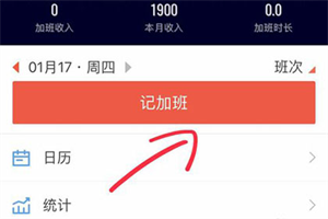 2、返回主页面,点击页面中间的【记加班】选项,设置每天的加班数据、加班倍数(每小时工资倍数,显示具体数值),并选择班次。