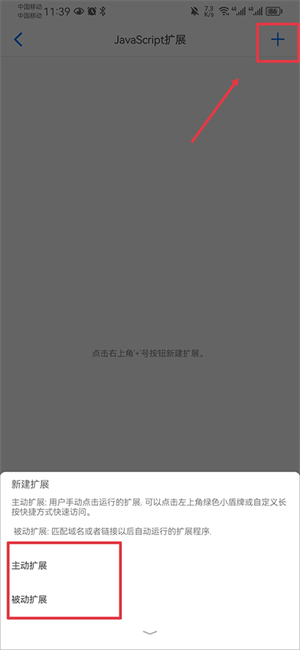 5、进入后点击右上角+号,然后选择主动扩展或被动扩展。