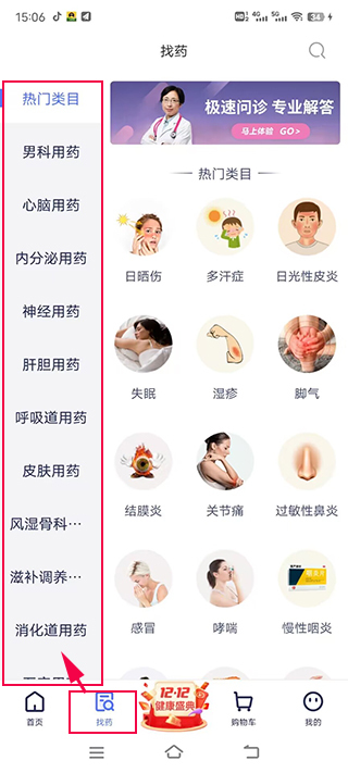 1、进入app"找药”,根据科室、疾病寻找需要购买的药物