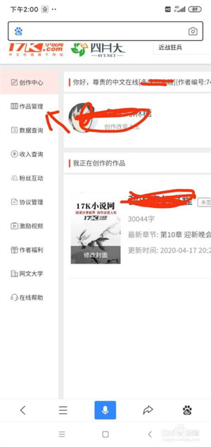 进入并登录自己的17k账号,点击左侧的作品管理。
