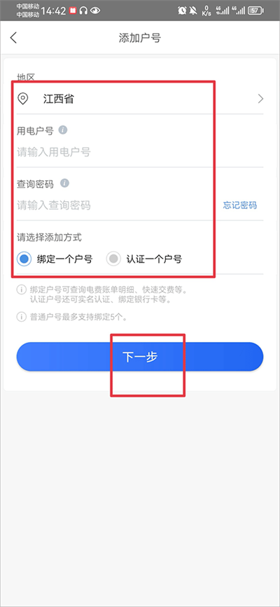 2、进入后选择地区、用电户号、查询密码后点击下一步