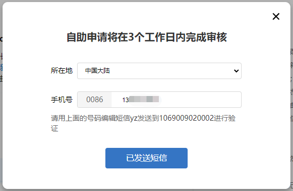 请依据提示填写相关信息,接着使用绑定的手机号码编写短信“yz”,并发送至1069009020002以完成验证。完成短信发送操作后,点击“已发送短信”按钮。系统会提示您:审核工作将在3个工作日内结束,审核结果会以短信形式发送至您绑定的手机,烦请留意查收。