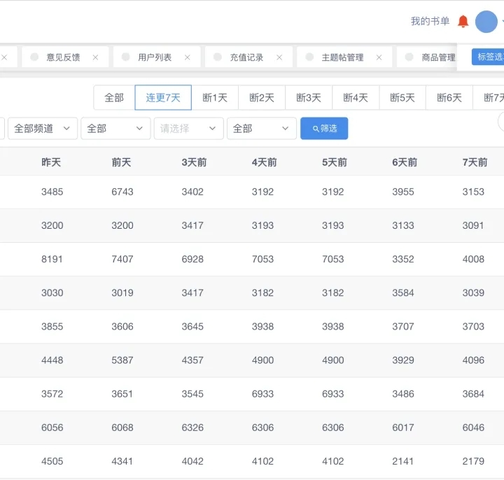 编辑后台可以看到7天的每日更新量,还能依据不断更、断1天,断2天分别筛选,没错,推荐就是先参考这个名单并结合成绩调度的……