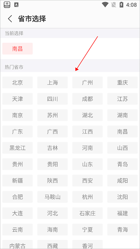 第三步:进入之后,能看到诸多省市,像“北京、上海、广州、重庆、天津、四川、成都、江苏”等大量热门城市,我们只需向下滑动,就能找到自己所在的省市。