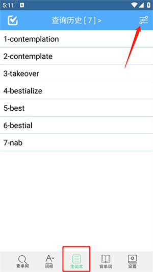 10、提供生词本,生词本内单词可以选择按字母排序、时间排序、随机显示功能,生词可以在背单词模块复习。