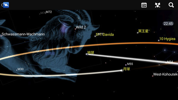 3、留意地球周边的橙色线条,这些线条代表着地球上空所有人造卫星的轨道,此为付费功能,需付费方可开启。由于所有天体均采用三维渲染,在此模式下,你能够通过手指拖动屏幕,360度旋转画面,从而从各个角度进行观察,也能用双指实现画面的放大与缩小。另外值得一提的是,软件中所有天体的相对位置,都是通过实时计算生成的,与它们在宇宙中的实际位置完全相符。所以,在这个地球的三维图像上,北京时间22:44分时,晨昏线的位置确实是其实际所处位置(印度洋以西、阿拉伯半岛东端),这使得探索过程极具真实感。倘若你在该位置将画面缩小到一定程度,便能在画面上看到月球的轨道。